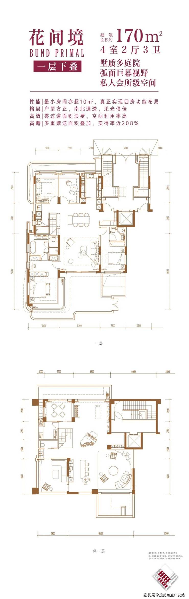 下叠(花间境):建面约170㎡,墅质庭院+弧面巨幕视野,私密性满分;