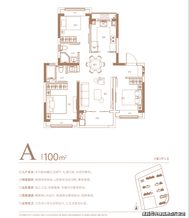 此外,南北通透、全卧飘窗、U型厨房等皆为标配。