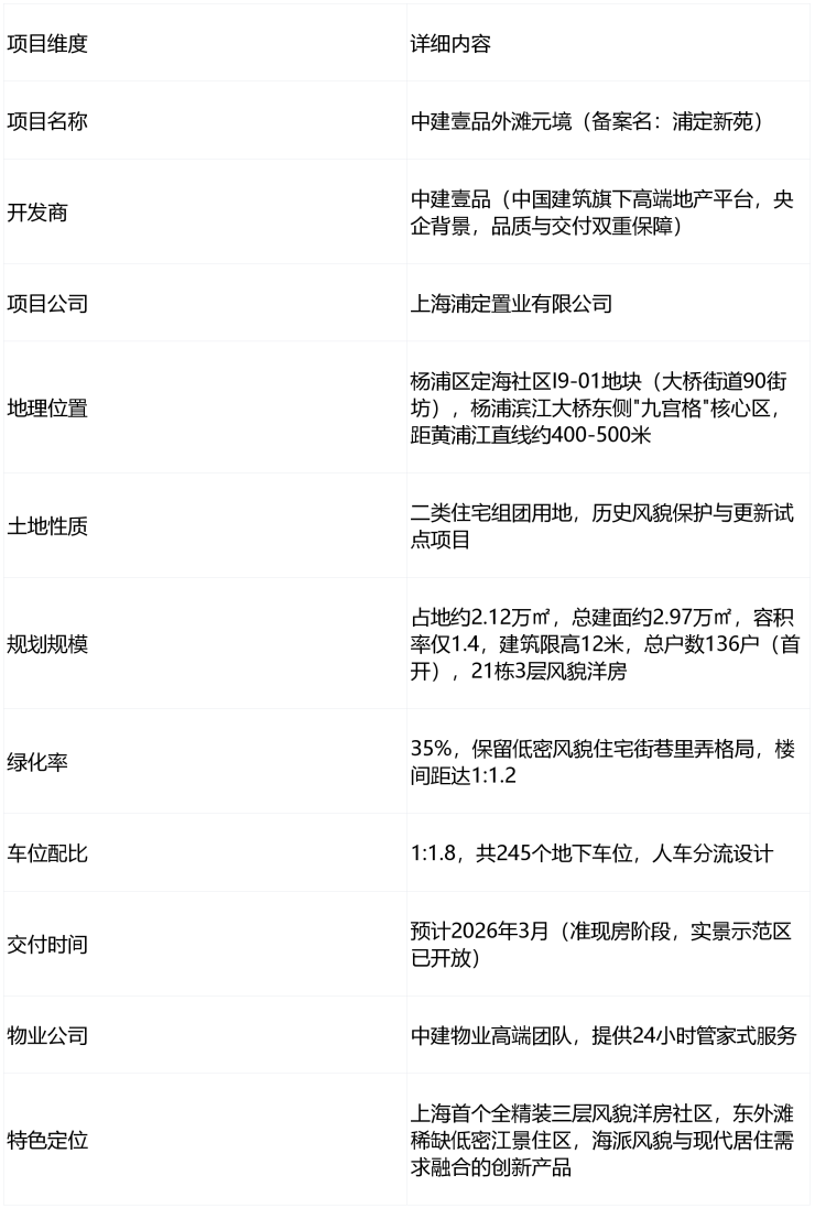 中建壹品外滩元境作为杨浦滨江九宫格核心+内环旁风貌低密住区的颠覆性创新产品,由央企中建壹品打造的上海首个全精装风貌退台洋房社区,核心优势可归纳为六大维度,完美融合外滩稀缺滨江资源与央企精工+超高得房率,是上海内环旁高端改善市场的“孤品级”项目。