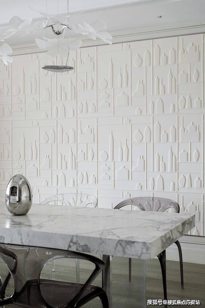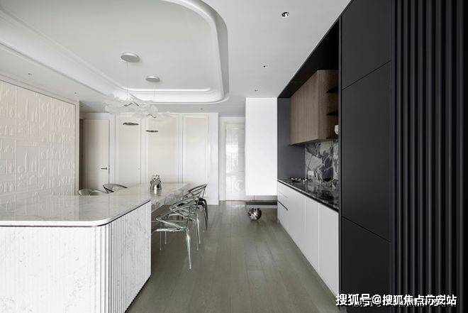 就餐厅暂离传统的固定设计方式,采用更新颖的设计方法缔造潮流惊喜。餐桌联合岛台,扩展用餐面积,赋予更加灵动洒脱的形态。另外通透亚克力支柱呈现的隐身姿态,赋予空间更温馨淡然的氛围。