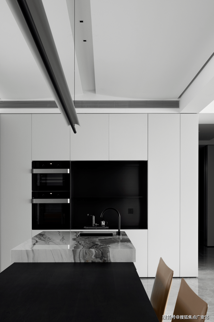 厨房整体设计优雅而整洁,透露着简洁与精致的美学理念。白色橱柜在营造出开阔明亮空间感的同时,巧妙削弱了厨房烹饪时易产生的油烟感,赋予厨房清新洁净的氛围。