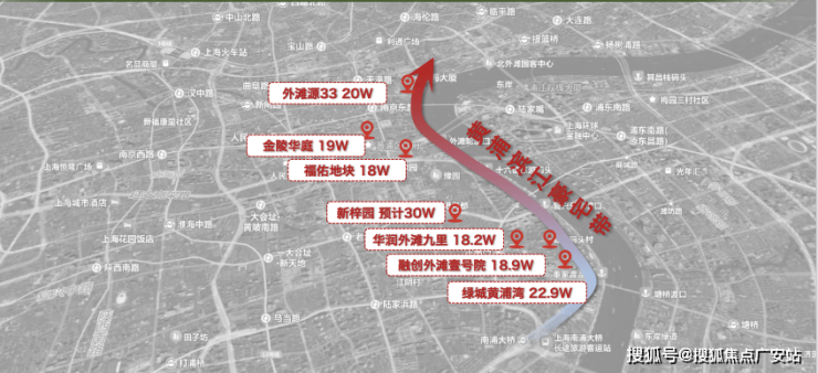 虹口四川北路-临平路14.78-16.6万/㎡,北外滩绿城地王楼板价达约13.6万/㎡,这一楼板价,几乎与保利外滩启PARK77均价(13.55万/㎡)持平,未来该地块也将剑指20万/㎡。