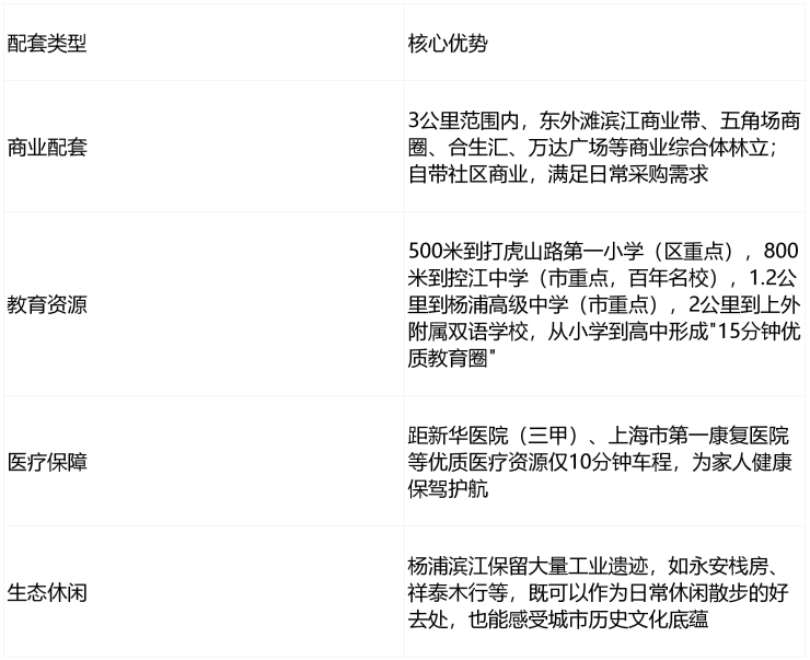 商业配套:五角场商圈(合生汇、万达广场)约3公里;滨江商圈(江湾里商业中心)约1公里