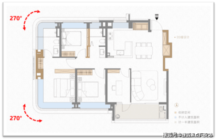 第三处山墙s墙的技术含量更高,直接让户型拥有两个大转角飘窗(主卧+主卫均双270°弧形转角飘窗)。凹处填放一个衣柜,视觉效果舒适,业主第一眼无知无觉,殊不知背后大有玄妙。
