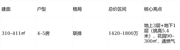 规划指标:总建面约33万㎡;容积率1.0(超低密),绿化率35%;住宅60套、商墅14套;车位比1:2.1;法式干挂石材外立面