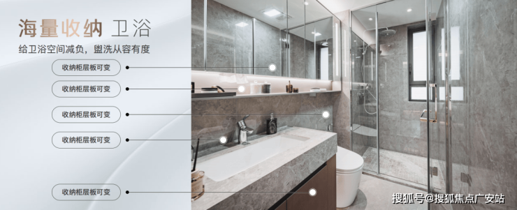 卫浴收纳系统:可抽拉龙头、收纳柜层板可变式设计、金属拉篮式设计、预置吹风机器、270°镜、防雾镜、美颜灯等;