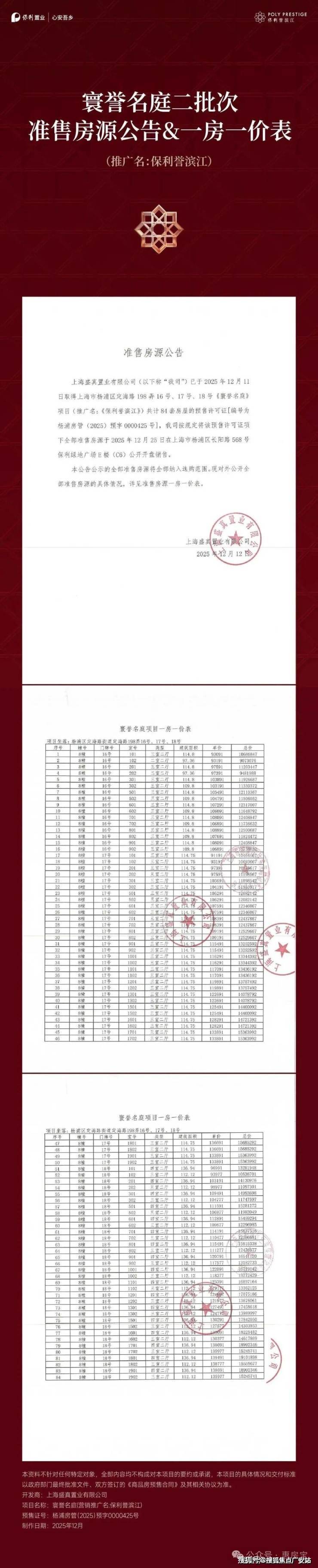 项目要素详细信息开发商上海盛真置业有限公司(保利发展控股)项目地址杨浦区定海路198弄(东至L4-11规划街坊通道、南至L4-11规划街坊通道、西至定海路,北至L4-10规划绿地)占地面积约21,150.46㎡(2.12万㎡)总建筑面积约88,419.63㎡(8.84万㎡)容积率2.5绿化率35%总户数383户(部分来源379户)车位数/配比497个,1:1.2(部分来源1:1.31)建筑类型8-17层高层、4-6层叠墅、洋房,共8栋住宅产权年限70年(普通住宅)物业保利物业,物业费9.8元/㎡/月交付标准精装修预计交房2028年6月30日(部分来源2027年底)