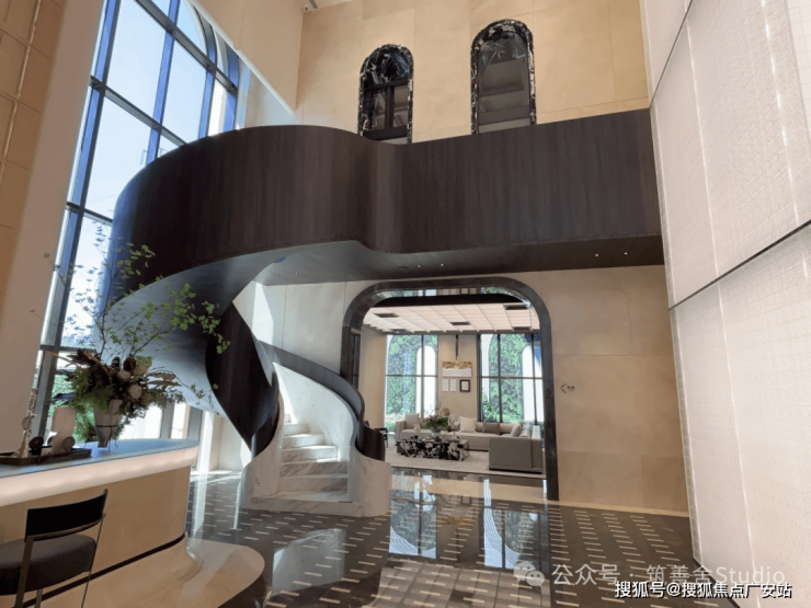 一整排连续的石材拱券,以约12米的超高姿态,气势恢宏地贯穿整个主入口,并沿着京杭大运河一路延伸,尽显磅礴气势。九米设计以“意式拱券”与“斯卡帕叠级”为设计语言,匠心打造了一座“漂浮于运河之畔”的地标建筑。其基座设计高达约11.5米,精选石材材质,巧妙融入西方古典拱券元素,并运用叠级手法,层层递进,极大地增强了空间层次感,营造出鲜明的欧式建筑秩序感,奠定了庄重典雅的基调。