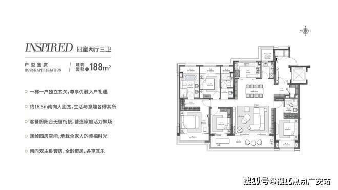 户型:主力为三居室(119㎡、140㎡)及四居室(158㎡、188㎡),南北通透、厨卫全明设计