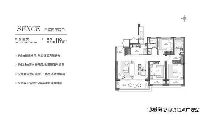 Youdaoplaceholder0: The main units are three-bedroom (119㎡, 140㎡) and four-bedroom (158㎡, 188㎡) with north-south ventilation and bright kitchens and bathrooms