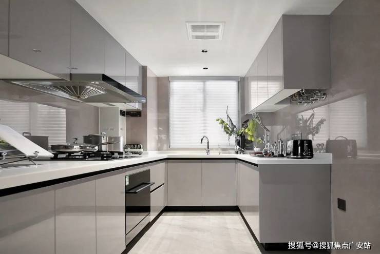 厨房空间,采用铝合金玻璃PVC饰面的免漆门套及铝合金移门,三件套使用老板的油烟机、燃气灶、洗碗机交付,更有摩恩的水槽和龙头、定制的组合橱柜。