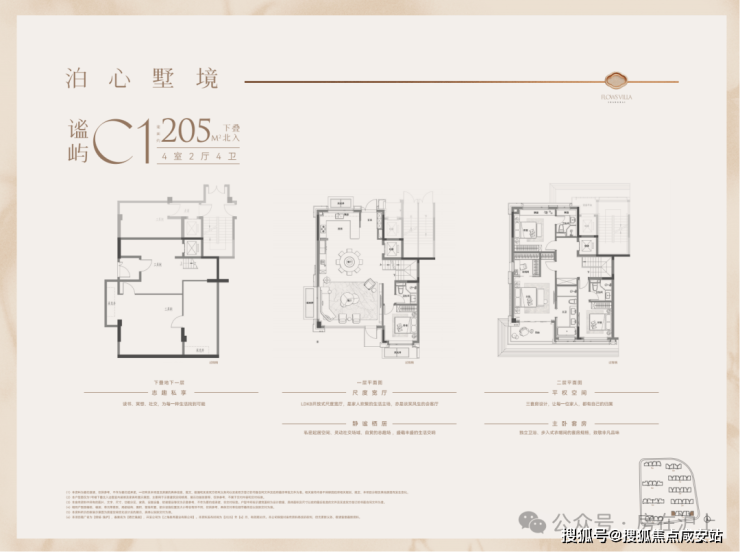 户型特点:下叠边套,南向面宽约9米,客餐厅同宽约5.8米,空间开阔。一楼设南向卧室,采光好且视野佳。二楼为三套房+主卧总统套房设计,主卫南向,可容纳浴缸和双台盆。地下室方正,附赠采光井,利用率高。