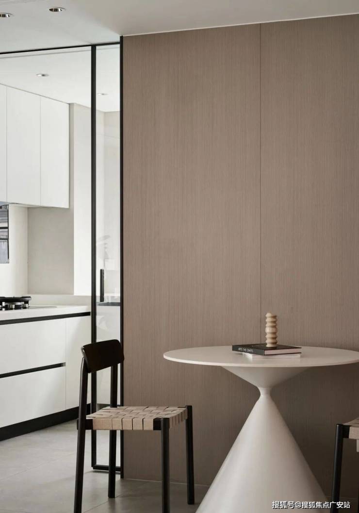▲ 平时就餐则在小圆桌进行,厨房采用吊轨玻璃移门隔断,不留卫生死角