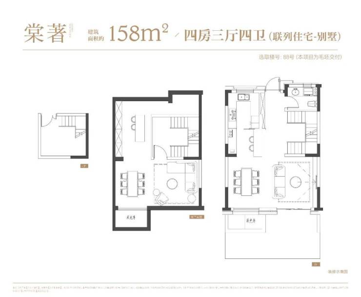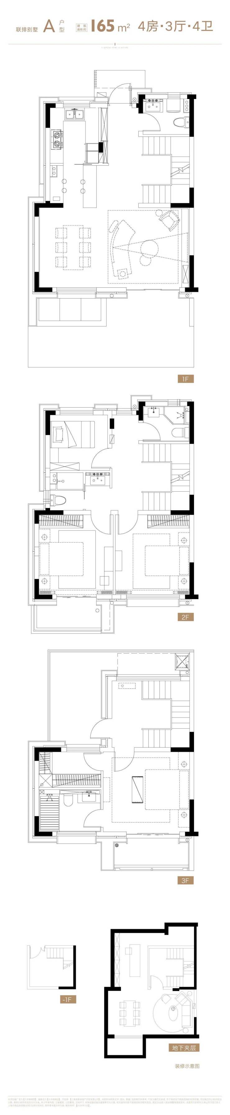 联排别墅主打约158-165㎡地上三层产品,带露台和相对独立的使用景观分区。