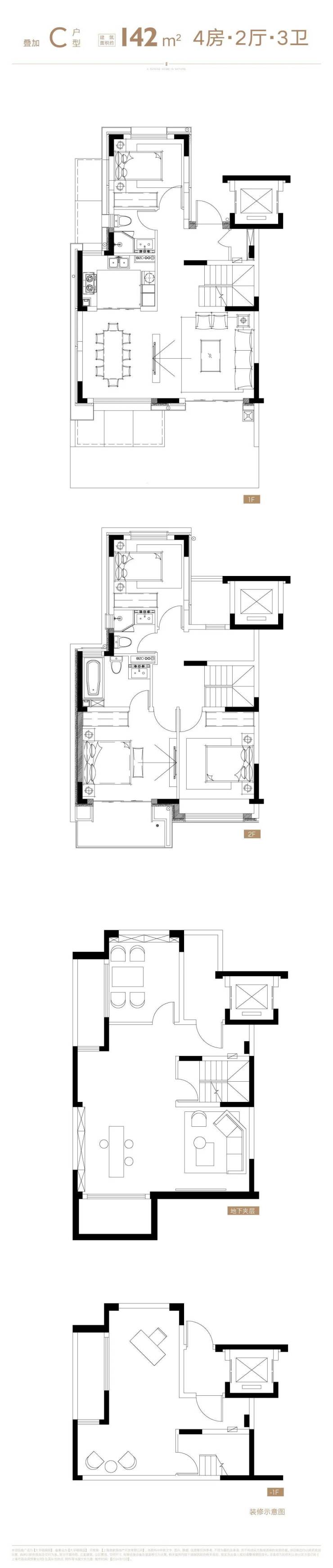 4层叠墅分为上/下叠,上叠建筑面积约139㎡,下叠建筑面积约142㎡,均为4房设计。