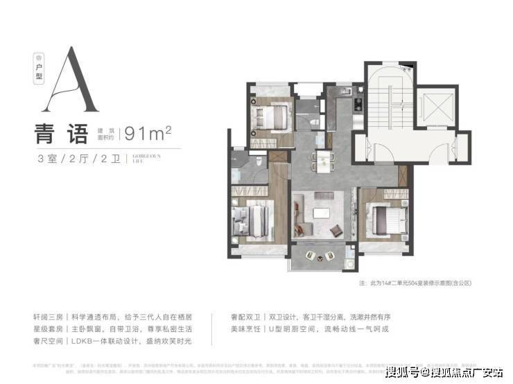 哪怕是最小的约90㎡也做到了3房2卫,三开间朝南、全屋3个大飘窗赠送、开敞阳台,客卫干湿分离、U型厨房…堪称满分上车户型!