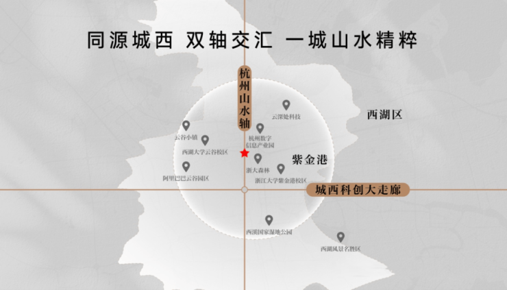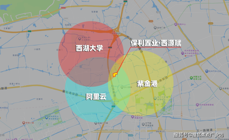 【保利置业·西源赋】是西湖、西溪以北绕城内与蒋村地王并存的唯二新盘。正处城西大走廊的起始点紫金港板块,东南约1.5km即为浙大紫金港校区,直线距离建设中的地铁4号线莲池站仅约660m。