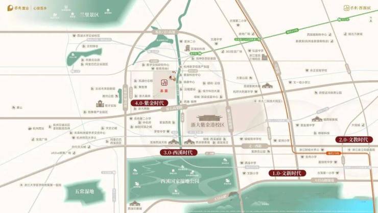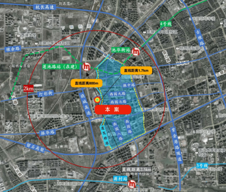 9.正处城西大走廊的起始点紫金港板块,东南约1.5km即为浙大紫金港校区,直线距离建设中的地铁4号线莲池站仅约700m。