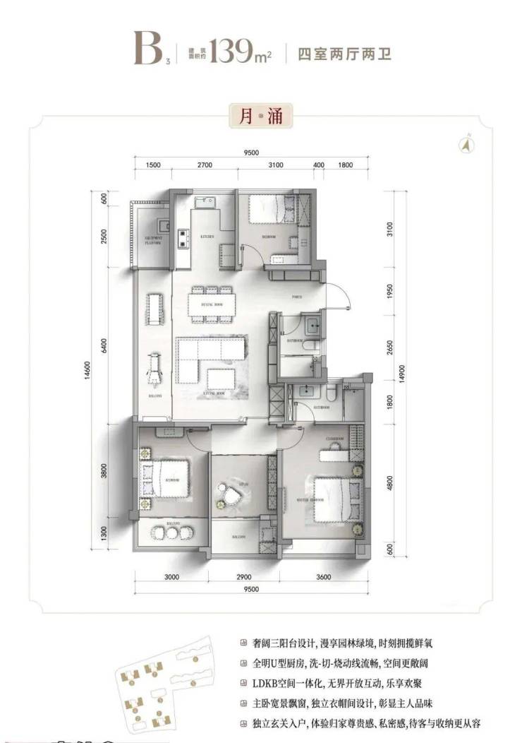 125㎡4室2厅2卫(中间套)四开间朝南设计,南向面宽拉满,采光通风效果俱佳;LDKB空间一体化布局,灵活适配二孩家庭日常居住需求;主卧套房设计,配备独立卫浴与专属衣橱,私密性十足;封闭式阳台可灵活改造,进一步提升空间利用率!