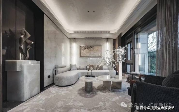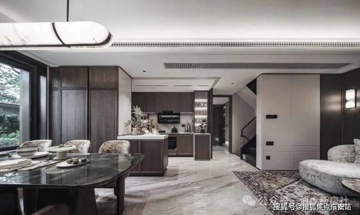 首先是奢石含量极高,从入户处的玲珑玉拼花与透光云石辉映,到翡翠绿奢石墙景、再到发光云石装饰点亮归家路,石材的典雅贯穿始终。