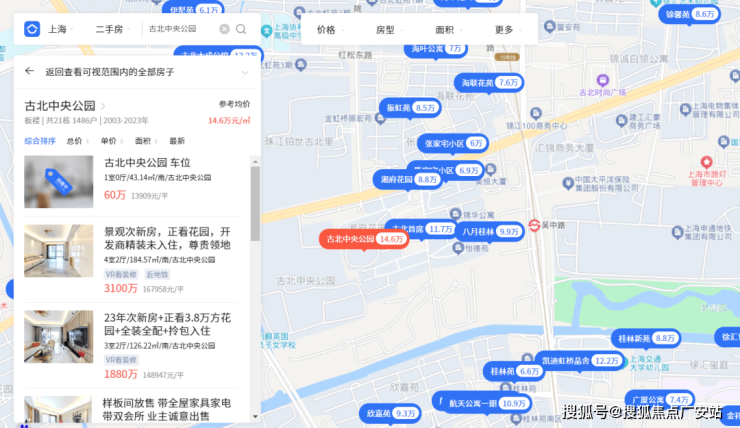 而古北二期近20年房龄,挂牌价11.5-14万/㎡,一街之隔的古北中央公园挂牌14万+/㎡,古北99甚至是全市鲜有存在“倒挂”的项目,资产安全性更高。