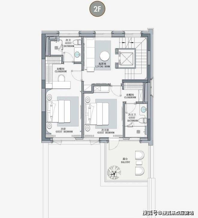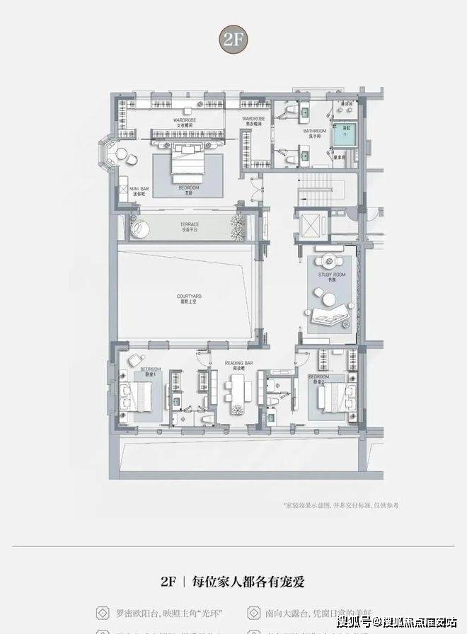 客厅互通,彰显家族生活的轩阔厅堂,2F家庭层,儿女的幸福与陪伴皆在左右,3F总裁套房式Penthouse,用具象的尺度描写人生成就的高度。