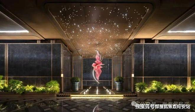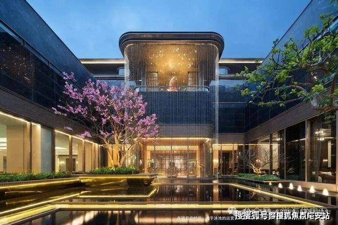 下沉式环幕庭院,跌水景观环绕,池底仿黑金砂与宝石晶片闪烁,点缀百余灯珠,师法“琉璃水光” 形意,糅合视听五感,打造全浸式立体园境,天工巧夺,嘉定未见。