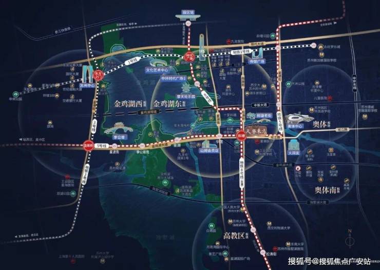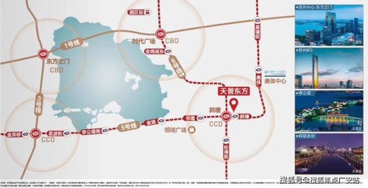 5号线为苏州换乘王”,贯穿园区/姑苏/新区,向东1站奥体/向西1站山姆/3站李公堤/5站金厍桥站。