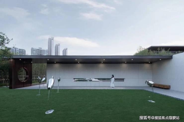 信步转场之间,由山野归林间,是一方返璞归真的自然禅境,开阔的绿野有悠闲的雕塑,似踱步于浮洲,如停驻于绿波,写意舒朗的自然景观通过景窗、转角、格栅变幻出更多的层次和感受,且将这份适意融入眼前的自然风物中,随心去畅游。