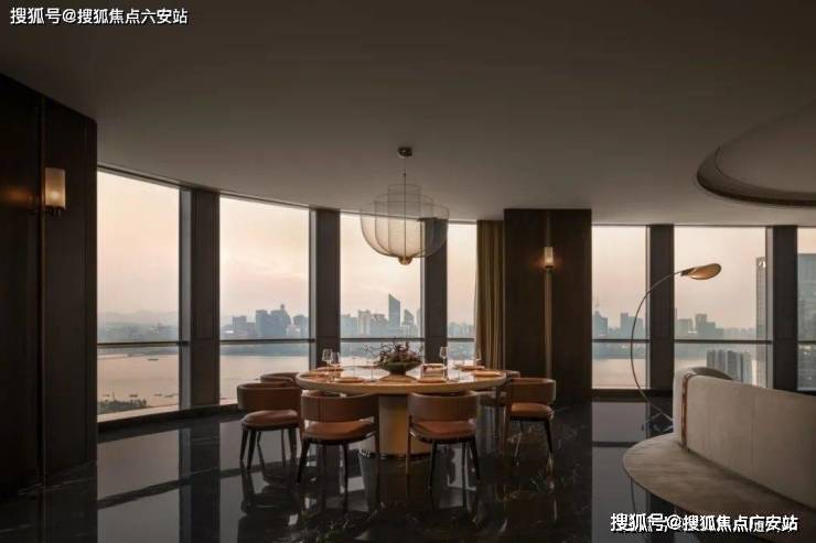 项目利用这一优势,打造了270°弧形转角客厅,营造出IMAX级的视觉体验。在约875平方米的楼王户型中,横向65米面宽环幕厅将“钻石之角”观景位的优势发挥到极致,揽江、观城、望山三重景观尽收眼底。