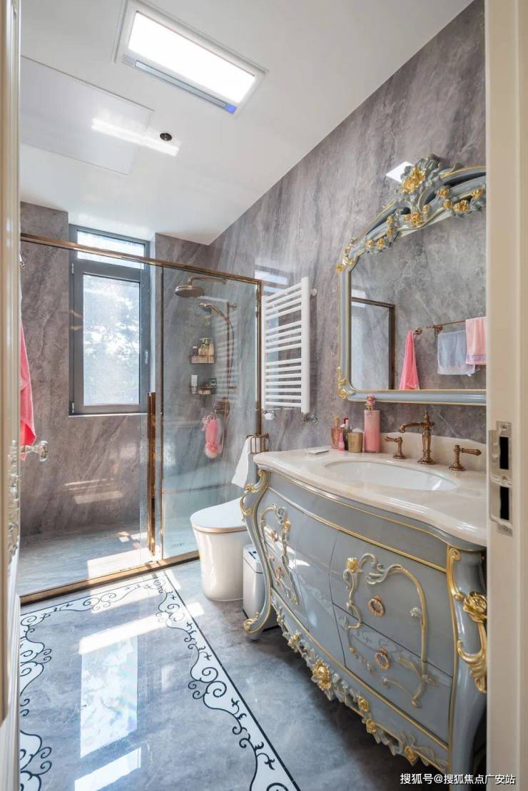 即便是私密的卫浴间,挚友也未曾忽略对美的追求。简一阿波罗灰墙地通铺,与质感水晶灯、法式风洗漱台相得益彰,展现出低调而高级的自然美感。