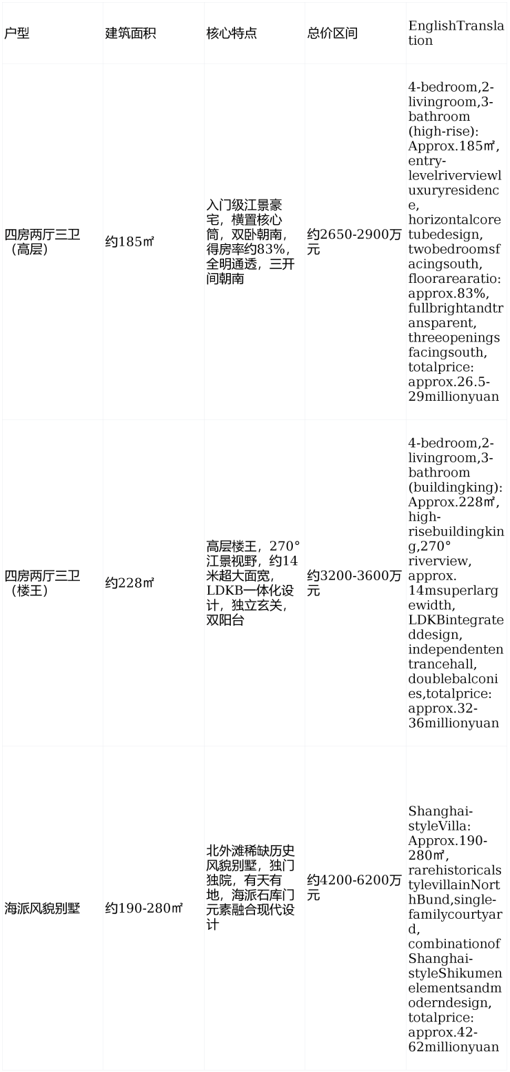Theexteriorfacadeadoptsacombinationofaluminumpanels+stone+large-areaglasscurtainwall.High-risescreateamodernandminimalistriverviewskyline,whilevillasreplicatetheessenceofShanghai-styleShikumenarchitecture,withbluebricks,blacktilesanddormerwindowscomplementingeachother,becominganewlandmarkintheNorthBundhistoricalstylearea.Thecommunitytakes"river,forest,springandstone"asthedesignconcept,creatingacentralgardenofabout15,000squaremeters,seamlesslyconnectingtheHuangpuRiverviewwiththecommunitylandscape.Theinteriorisequippedwithinternationalfirst-linebrandhardcover,andhigh-risesadoptsmarthomesystemstorealizewhole-houseintelligentcontrolandhealthyenvironmentmonitoring.Thecommunityhasbuiltapproximately1,500㎡high-endclubhouse,includingconstanttemperatureswimmingpool,privatedininghall,fitnesscenterandothersupportingfacilities,implementingpurepedestrian-vehicleseparationandclosedmanagement,24-hourintelligentsecuritysystemtoensurethesafetyofowners.