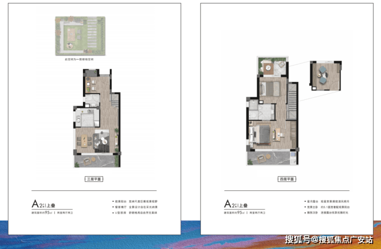 来看户型,面积段有两种——建面约95㎡下叠、上叠;建面约150㎡下叠、上叠。