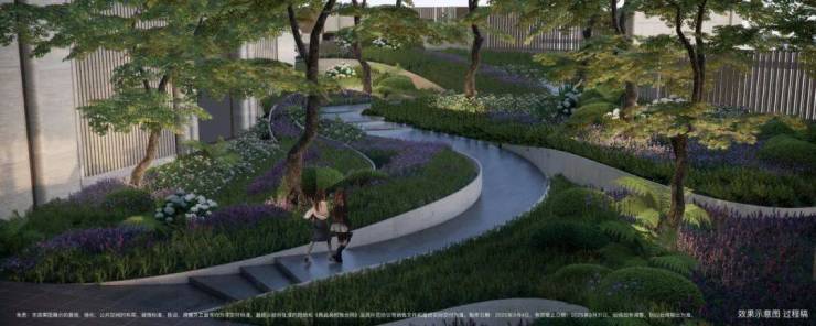 通过设计,将小区景观打造成了立体台地花园,设置缓坡、下沉式花园、台阶等,让整体景观表现出立体层次感,错落有致。
