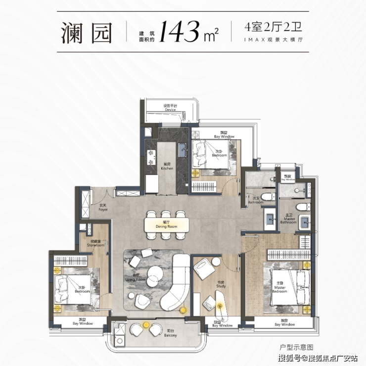 l超拓设计:三开间朝南+横厅,主卧套房配置独立衣帽间及270°转角飘窗,空间利用率大大提升。