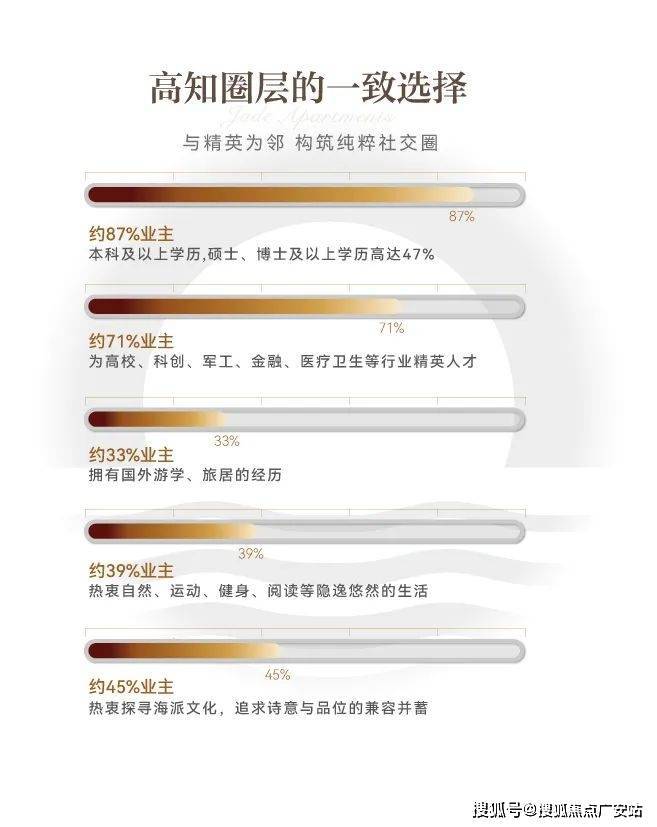 据统计,映江润府业主约87%为本科及以上学历,硕士、博士及以上学历高达47%!千金买房,万金买邻,像映江润府这样高比例的高知住区全市少有,而对于年轻的城市菁英们来说,无形的圈层代表着对社会资源的占有,决定着人生的高度。