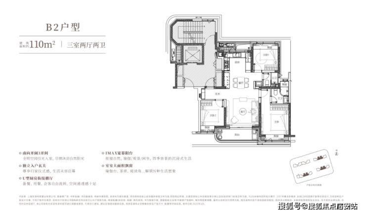 建面约110㎡边套(B1户型),1个宽面阳台、5个飘窗,整体南向面宽做到了约12.3米,大横厅面宽约5.4米,带来超大空间体验和充足通风采光。更为难得的是,该户型标配了全屋飘窗,主卧更是拥有270°转角飘窗,拓宽室内景观视野的同时,增加了实际空间使用率,加上三玻两腔系统窗隔音,在欣赏窗外景色的同时,也不会被噪音打扰。建面约110㎡中间套(B2户型),也同样做到了南北通透,三开间朝南,洄游动线,布局合理,无论是空间尺度还是通风采光,与边套享受一样的品质感!