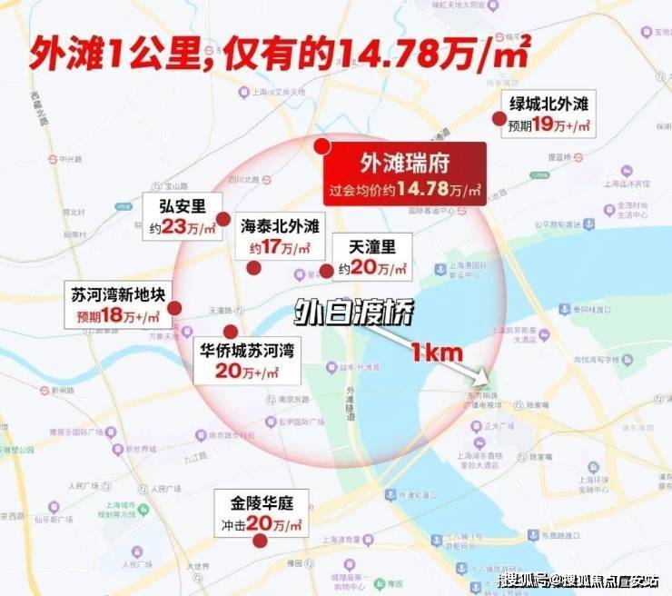 其次,在距离外滩1公里范围内,楼盘单价普遍达20万/㎡,只有外滩瑞府给出14.78万/㎡的上车机会。