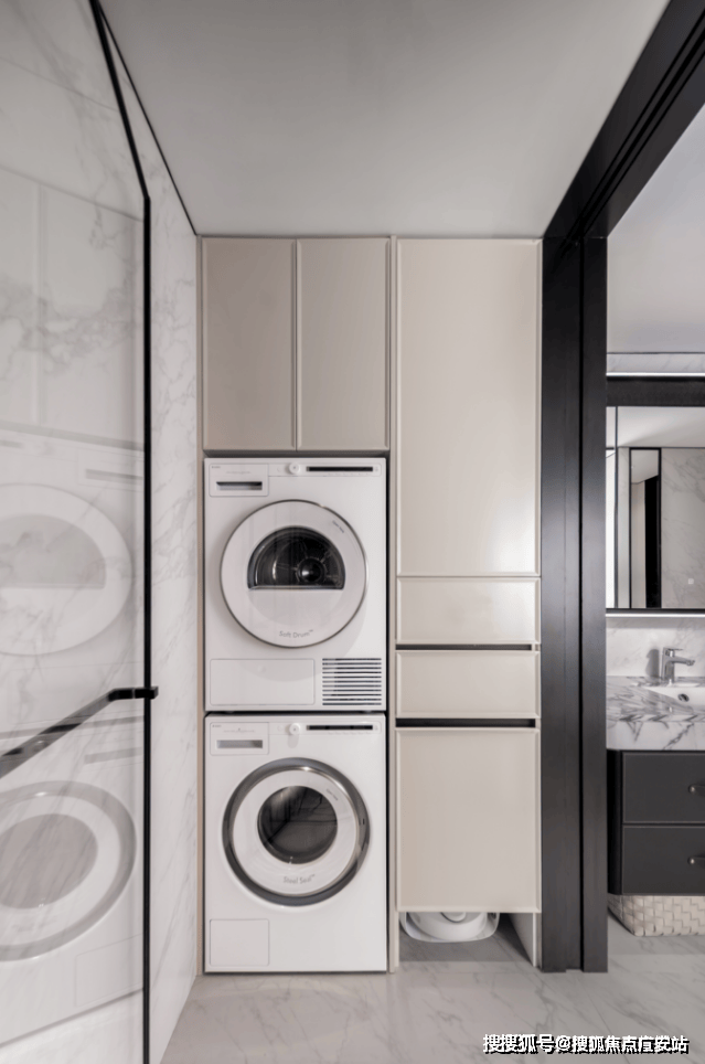 161户型还交付家政间,洗衣/烘干机和柜体都已配备齐全。