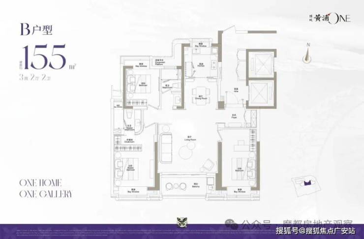 155㎡三房两厅两卫,采用经典“飞机户型”设计,是项目的爆款户型。核心价值点在于“全明通透+空间利用率拉满”: