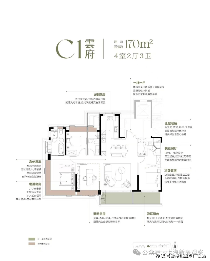 随后推出的 170㎡“悬浮全景舱”,直接引领上海高端户型革新—— 南向 15.8 米四面宽让每个空间都享阳光平权,深 U 型厨房预留西厨岛台,约8.35 米双阳台兼顾功能与情绪价值,双套房 + 270° 全景窗 + 三卫设计,更将 “新平权主义” 落到实处,让每位家庭成员都有私密空间;