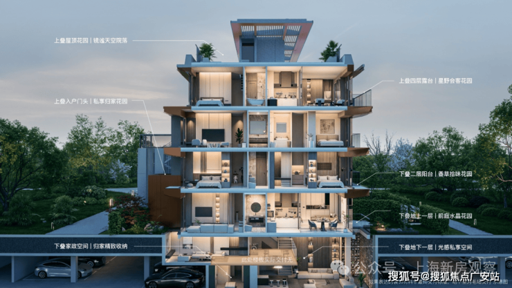 下叠:约5.45米可做跃层地下室,多个采光天井,还有南花园。