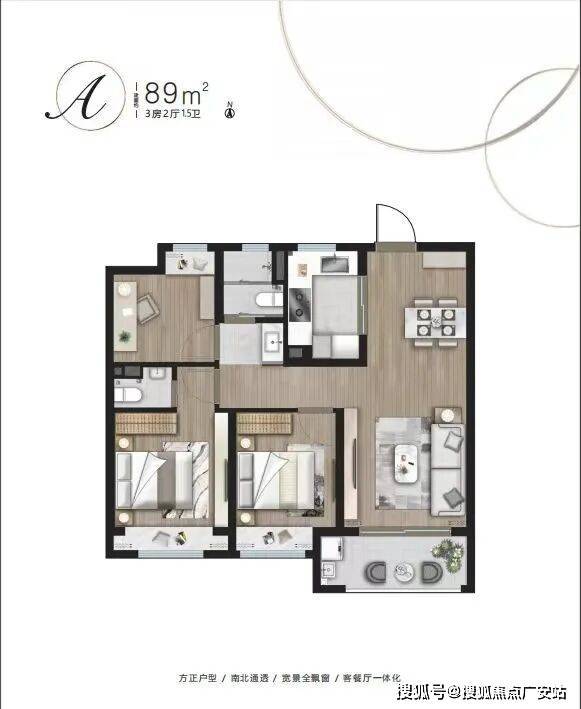 89㎡ 三房 1.5 卫:总价 354-380 万;三开间朝南、双联阳台、全明通透、得房率超 80%