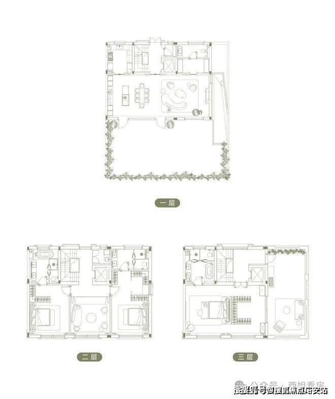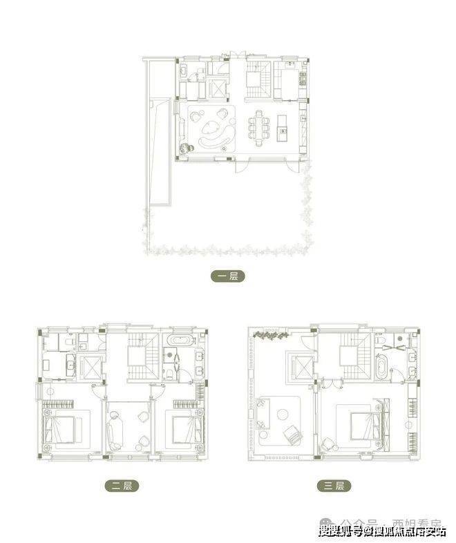 一层:社交空间(客厅+餐厅+开放式厨房+南向庭院)