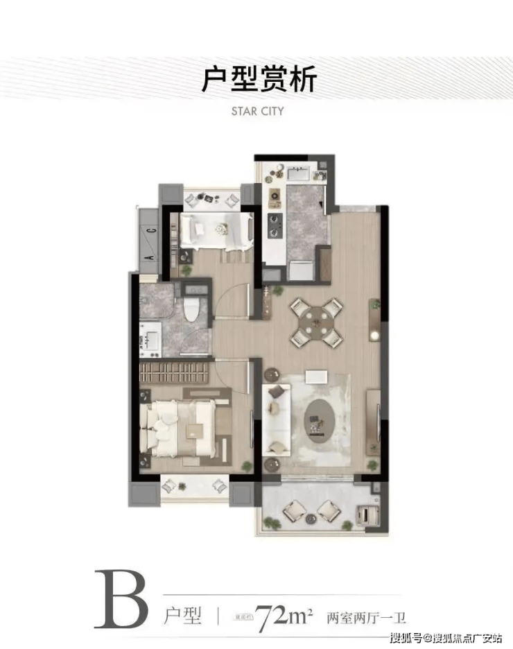 对于单身、新婚夫妇以及三口之家来说,该户型都已经够用!