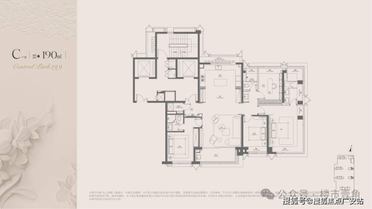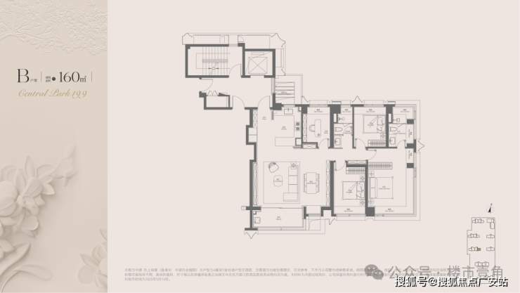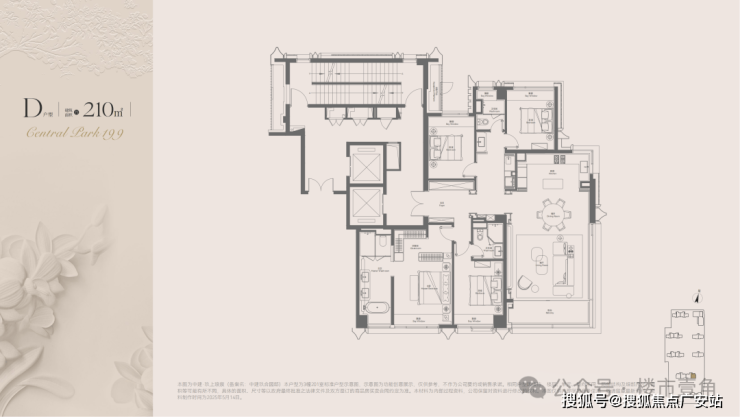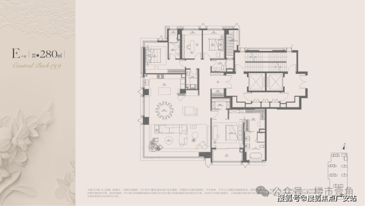 两梯两户+独立电梯厅+双套房格局。边厅设计带来东、南双向约270°采光,俯瞰中央下沉庭院与大宁公园,视野极佳。