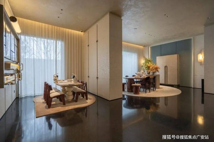 景观方面,围绕“一轴八境”展开,通过假山、叠水、屏风等元素展现东方韵味,下沉式庭院,搭配超6米高悬瀑,虹桥、景亭、松石错落有致。