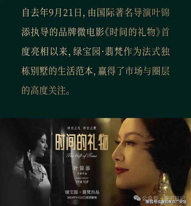 2024年,微电影《时间的礼物》首映,这部由奥斯卡得主叶锦添执导的大片,以其独特的艺术视角和非凡的艺术品位,深度诠释了“中国十大超级豪宅”之一『绿宝园·翡梵』的生活理念,为地产界艺术风潮注入新的活力,重新定义了豪宅的价值内涵。