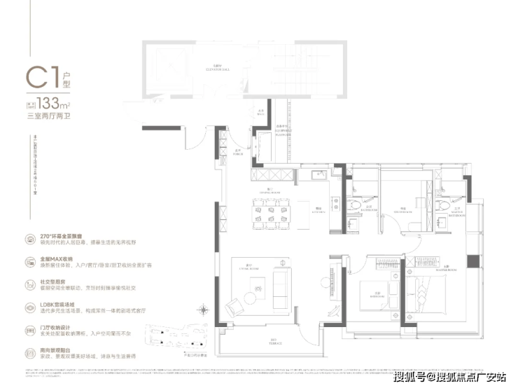 133㎡可以说是108㎡的进阶款,同样的三房两厅两卫,大面宽横厅、半开放式厨房设置岛台,加上主卧L型飘窗,再一次验证了华润置地豪宅化的产品思路。