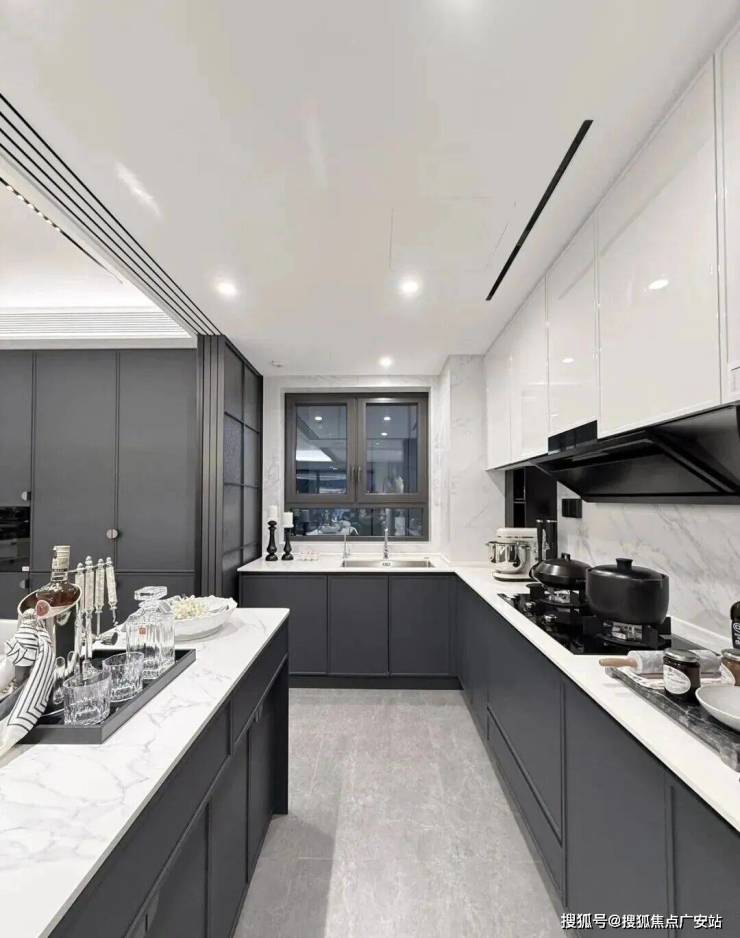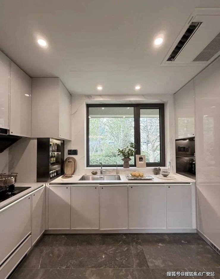 比如,厨房配了珍珠白吊柜、三组抽屉式拉篮合理搭配,调料架收纳、大容量踢脚抽、清洁用品收纳区,米面粮油、碗碟刀叉都可完美隐身。